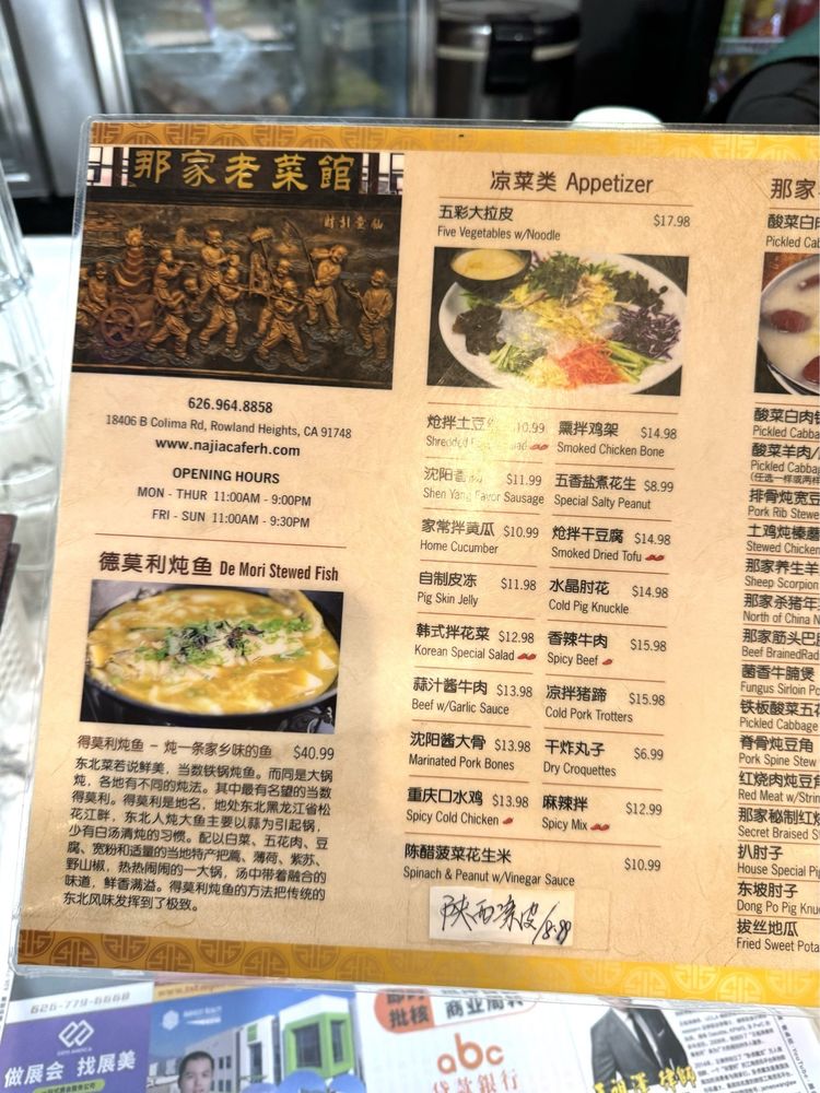Welcome to Na Jia Cafe, a delightful haven for those craving authentic northern Chinese cuisine in the heart of Rowland Heights. This charming eatery offers a vibrant menu that includes regional specialties like Guo Bao Rou and sour pickled veggie with pork belly stew, celebrated for their bold flavors and comforting essence reminiscent of "mom's cooking." With many vegetarian choices and generous portion sizes, they cater to diverse palates and dietary needs.